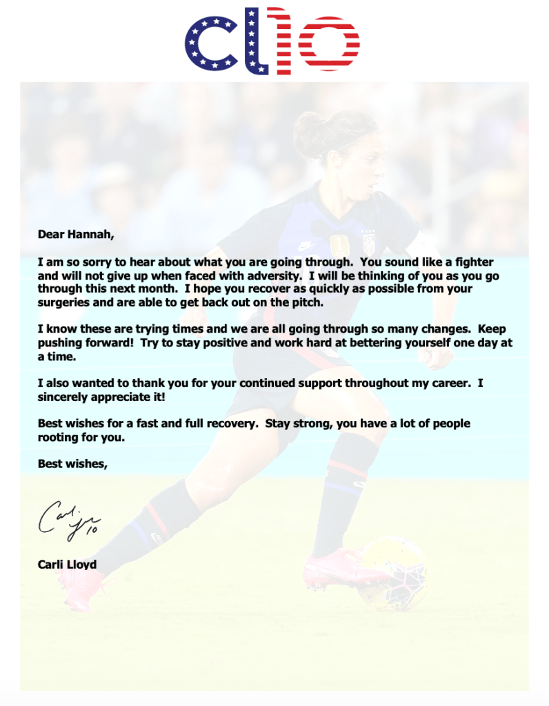 I love the positivity letter from Carli Lloyd!! I love her and I love soccer!! Keep up the good work Hannah! Your doing great- hope you pooped too!!! Lol